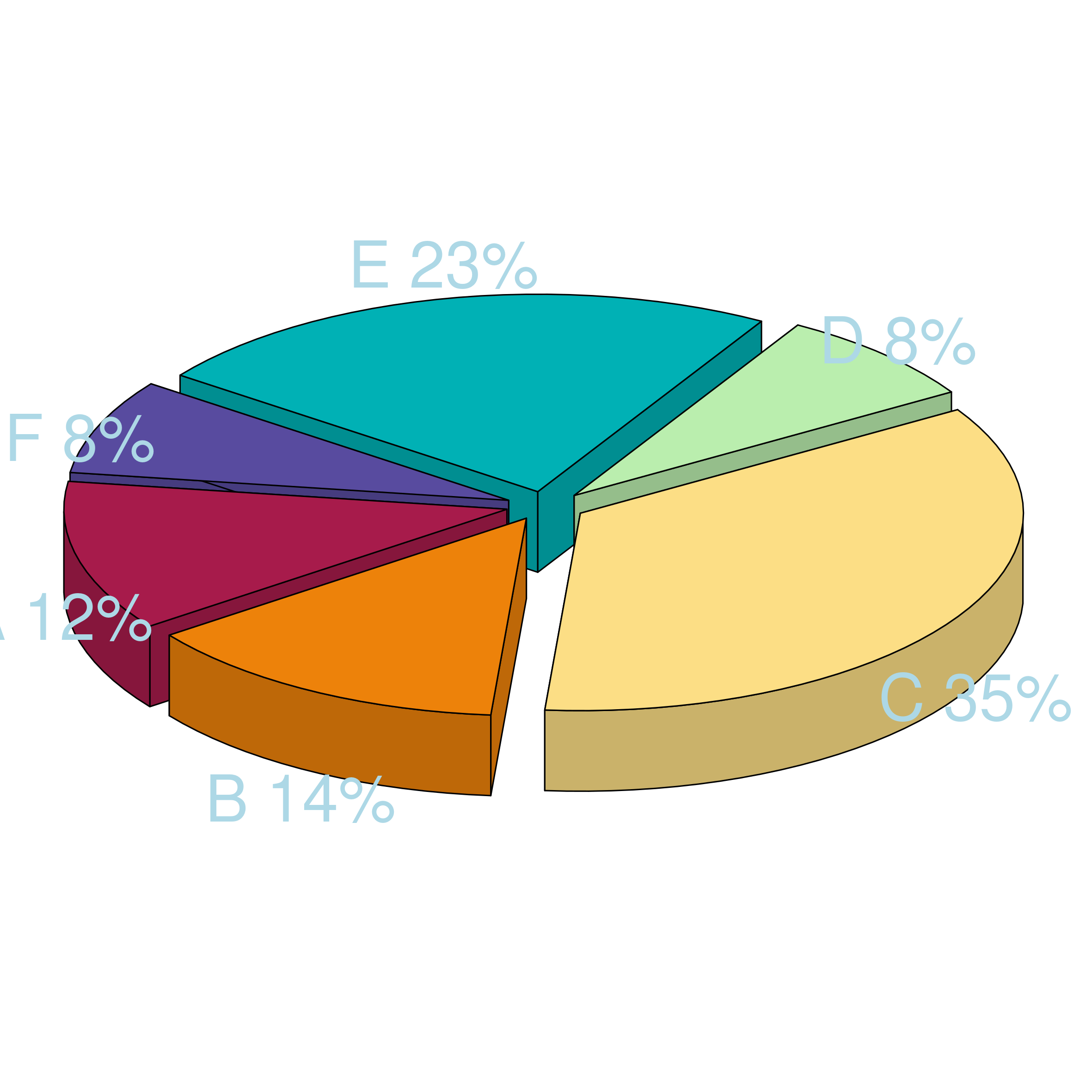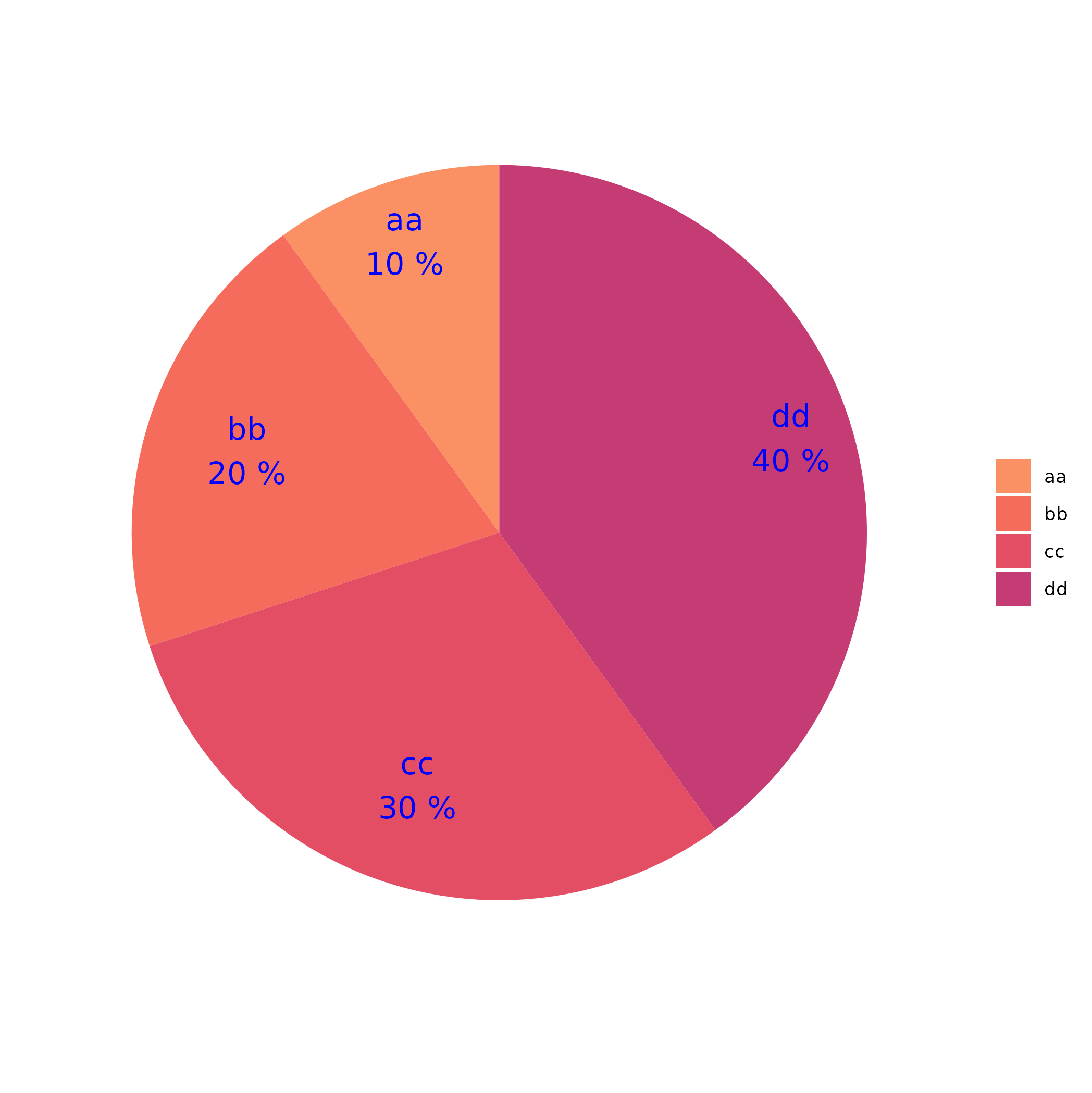 Ein Torten-/Kuchen-DiagrammEin Kuchen zeigt recht intuitiv an, welche Gruppen wie stark besetzt sind sind. Hier ein Beispiel für R und RStudio. Die relevanten Kuchen-Zeilen für das RMit diesen Zeilen habe ich es erstellt. Die R-Syntax ist leider nicht ganz trivial (wie immer eigentlich). Wir brauchen die library "ggplot2". Aus den Daten mit den Beschriftungen ("aa", "bb", usw.) und den Prozentwerten (10, 20, 30, 40) macht man ein eine kombinierte Beschriftung ("lb"). Diese soll an jedem Kuchenstück angebracht werden. Ich würde vorschlagen, mit diesen Zeilen in einem ersten Schritt zu experimentieren, Werte testweise zu verändern und zu sehen, wie weit R ohne Fehler zu melden, reibungsfrei mitgeht. Danach könnte man überlegen, seine eigenen Daten einzusetzen.
